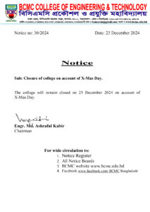 Closure of college on account of X-Mas Day